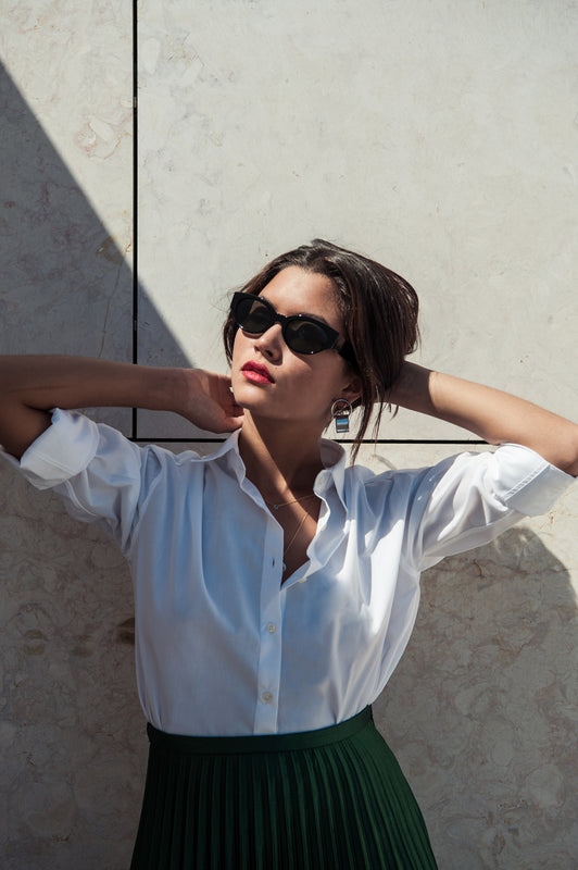 Oversized yet feminine, the classic boyfriend shirt reinvented. A loose body and dropped shoulders are paired with a formal collar and cuffs to make a new timeless staple in your wardrobe. The detailing is a mix of classic yet sporty, designed to take you from day to night.
